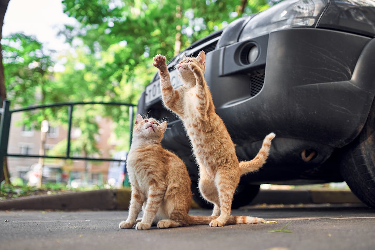 Laat de kat nooit los in de auto. Dat is gevaarlijk bij plotseling remmen, en bovendien kan een kat onder pedalen kruipen of uit een open raam springen. Houd de kat tijdens pauzes in het mandje of gebruik een speciaal kattentuigje met riem als je hem even uit de auto laat. Zet ramen nooit volledig open en parkeer op schaduwrijke plekken.